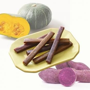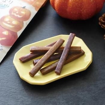 ■かぼちゃ:国産かぼちゃをほっくり蒸しあげ、国産かぼちゃパウダーとさつまいもを練り込んで焼きあげたジャーキー。しっとりやわらかな食感と、かぼちゃのやさしい甘みと香り、コクのある味わいが広がります。